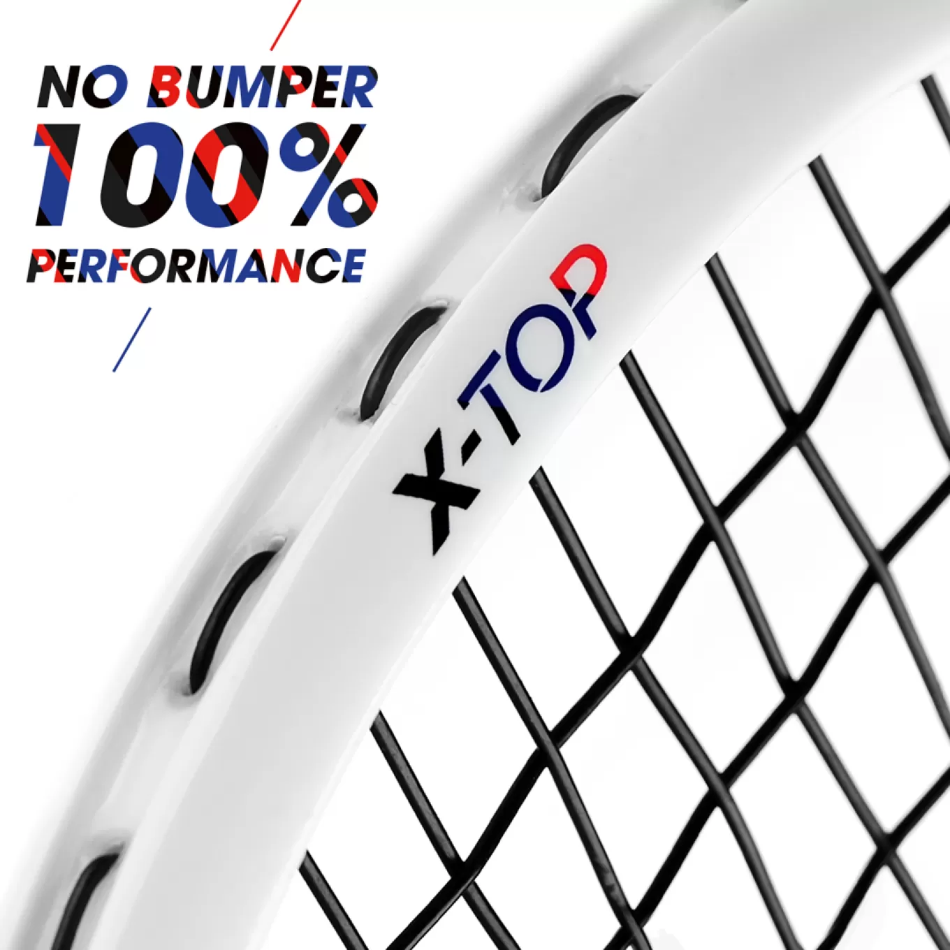 La gama CARBOFLEX X-TOP V2 es sinónimo de innovación, impulsada por la tecnología patentada X-TOP. En esta versión, se ha eliminado el tradicional bumper (protección de la cabeza de la raqueta) y se ha sustituido por una estructura completamente nueva que maximiza el rendimiento. En lugar de plástico, el bumper ha sido reemplazado por una mezcla de fibras de aramida, un material altamente resistente a los impactos, y un tratamiento de PTFE, que mejora el deslizamiento y protege el marco contra la abrasión. Sin el bumper, la raqueta se vuelve más aerodinámica, lo que permite una mayor velocidad de swing y, en consecuencia, más potencia. Al emplear materiales en lugar de plástico, se han incorporado más fibras que mejoran la respuesta, reducen las vibraciones y aumentan la comodidad.